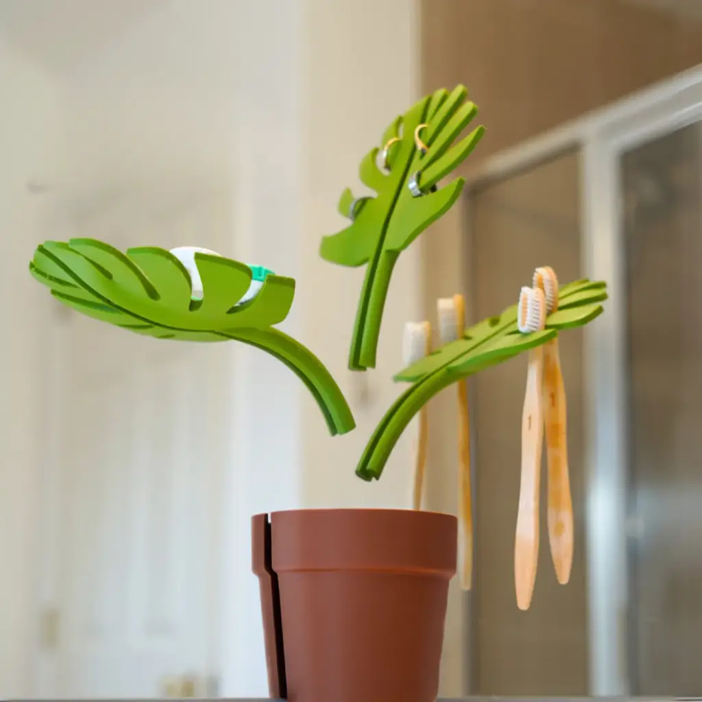 Monstera Banyo Lavabo Seti, doğadan ilham alan Monstera yaprağı formu, Lego benzeri modüler estetik ve fonksiyonel tasarımı ile banyonuzda hem şıklığı hem de düzeni bir arada sunar. Pinterest tarzı minimalist banyolara özel olarak tasarlanmış bu ürün, 3D baskı teknolojisiyle çevre dostu PLA malzemeden üretilmiştir.
